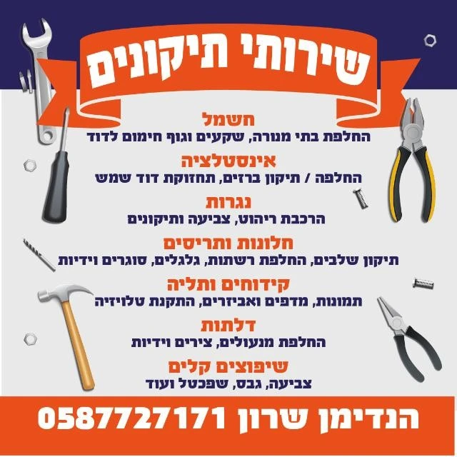 הנדימן שרון מספק מגוון רחב של שירותי תיקונים והתקנות לבית ולעסק, תוך הקפדה על עבודה מקצועית, אמינות ושירות אישי. השירות כולל תליית טלוויזיות, התקנת ארונות, התקנת מנורות ועוד מגוון עבודות תחזוקה שוטפות. עם ניסיון בשטח ויכולת לתת פתרונות מהירים ויעילים, הנדימן שרון פועל באזור יקנעם עילית, חיפה, חריש, נשר, טירת הכרמל וזכרון יעקב, ומתחייב לשירות איכותי שמותאם לצרכי הלקוח.